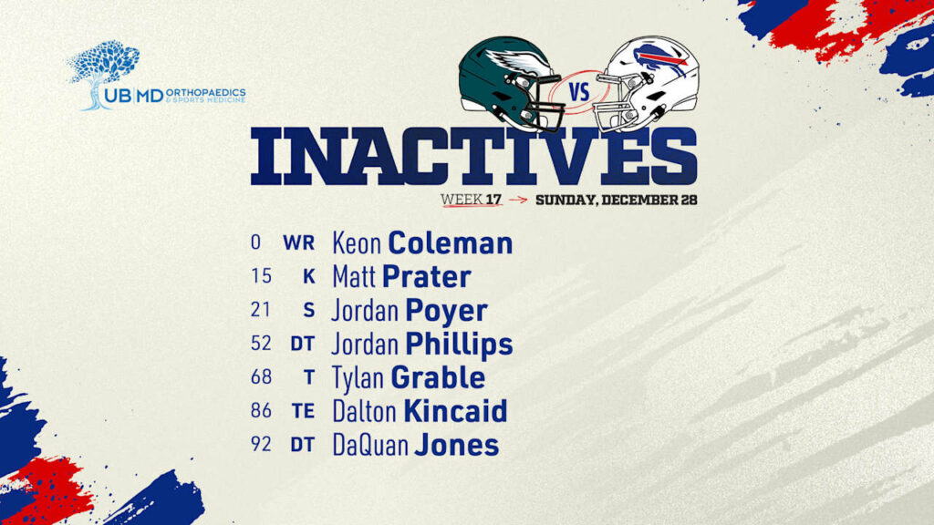 The Bills previously ruled out Prater, Poyer, Phillips and Jones on Friday. Kincaid (knee) was listed as questionable but will not play Sunday.